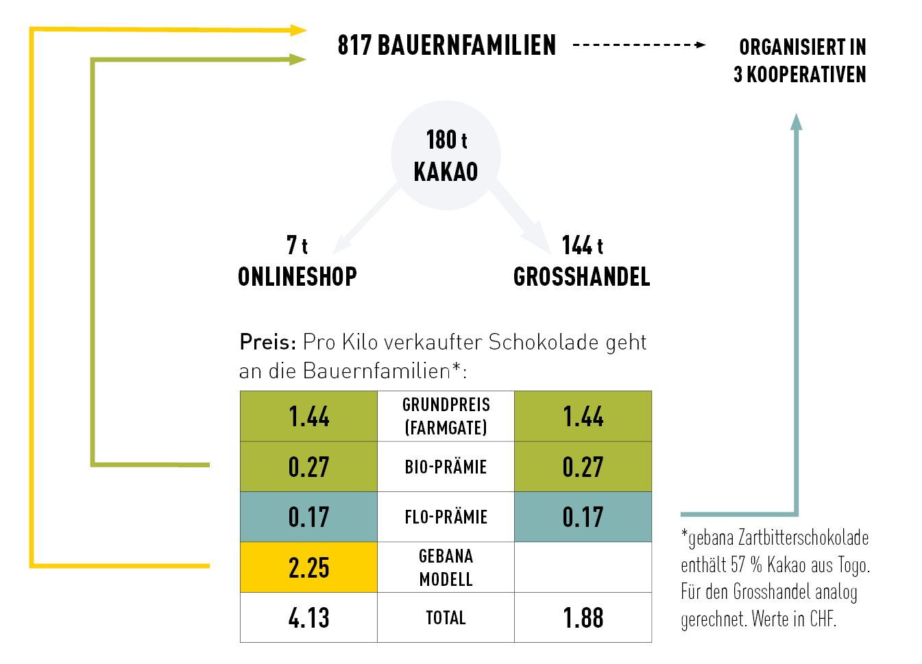 Damit wir mit dem gebana Modell in Togo wirklich etwas bewirken können, müssen wir also viel mehr Schokolade verkaufen. Oder den Grosshandel miteinbeziehen. Im Januar haben wir deshalb unsere Grosskunden an den Tisch geholt und ihnen erklärt, dass unsere Bio- und Fair-Trade-Preise nicht existenzsichernd sind. Nicht für die togolesischen Bauernfamilien mit ihren 1.5 Hektar Land und 400 Kilo Ertrag pro Hektar. Wir forderten die Grosskunden deshalb auf, schrittweise höhere Preise zu zahlen. Wir geben jeden Rappen dieser Preiserhöhung vollständig an die Bauernfamilien weiter.